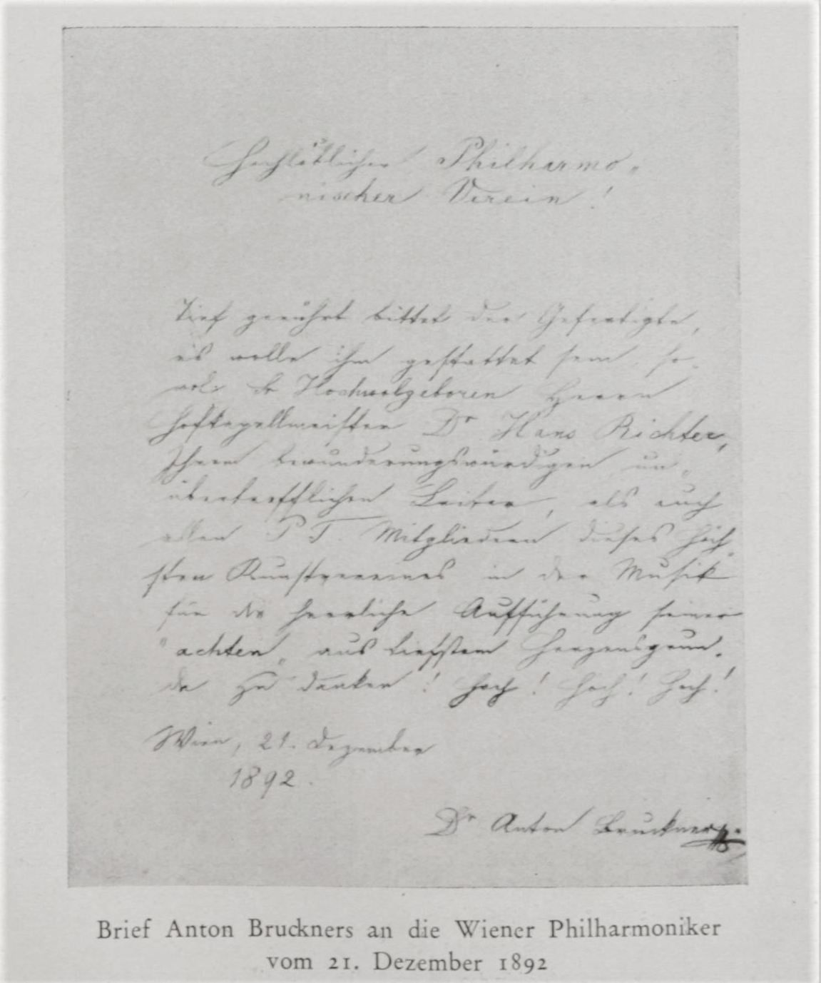 Der ersten vollständigen Aufführung einer seiner Symphonien in einem Philharmonischen Abonnementkonzert ging ein irritierender Brief Bruckners voraus: „Es wolle mir das ergebene Ansuchen gestattet sein, das löbliche Comite möge für dieses Jahr von dem mich sehr ehrenden und erfreuendes Projecte der Aufführung meiner Edur Symphonie Umgang nehmen, aus Gründen, die einzig der traurigen localen Situation entspringen in Bezug der maßgebenden Kritik, die meinen noch jungen Erfolgen in Deutschland nur hemmend in den Weg treten könnte. In aller Verehrung Anton Bruckner.“ (Briefe I, 851013/1). Das Komitee der Wiener Philharmoniker blieb allerdings bei seinem Entschluss, zeigte keine Scheu vor der „maßgebenden Kritik“, und die von H. Richter dirigierte Erstaufführung der Siebenten Symphonie (21.3.1886) wurde zu einem überwältigenden Erfolg für den Komponisten. Vor einigen Jahren gelang dem Historischen Archiv der Wiener Philharmoniker der Erwerb eines eigenhändigen Entwurfes zum zitierten Brief, diesem Akt der Verzweiflung, der Karl Kraus (1874–1936) 1906 zum Bild der „boshaften Zwerge[n]“ inspirierte, die „über gutmütige Riesen herrschten“ (Kraus zit. n. Partsch, in: Bruckner-Handbuch 2010, S. 351). Seiner Ansicht nach stellte Bruckners Versuch einer Verhinderung der Aufführung eine Maßnahme dar, die „ein furchtbares Urteil über das geistige Wien enthält. Ein Dokument von der journalistischen Zeiten Schande, wie es überwältigender nicht gedacht werden kann.“ (Kraus zit. n. Partsch, in: Bruckner-Handbuch 2010, S. 352).